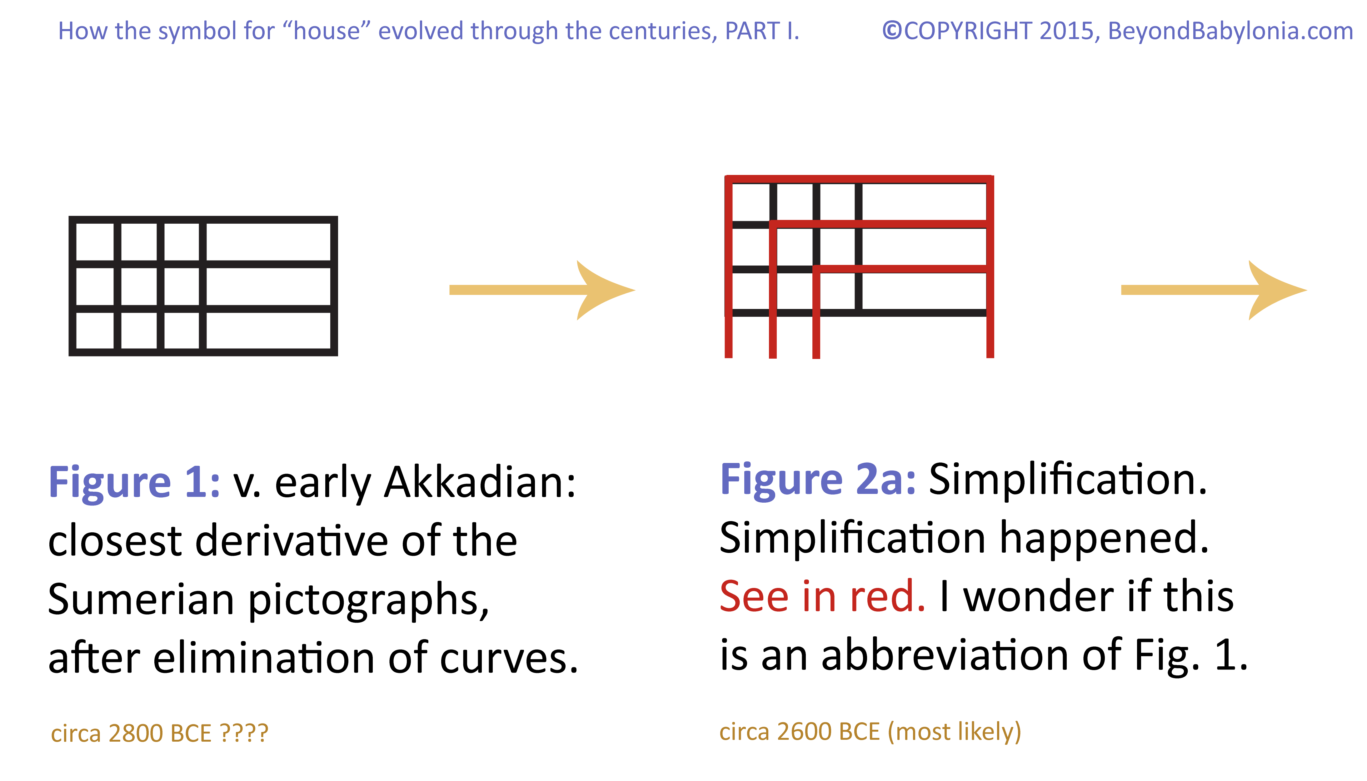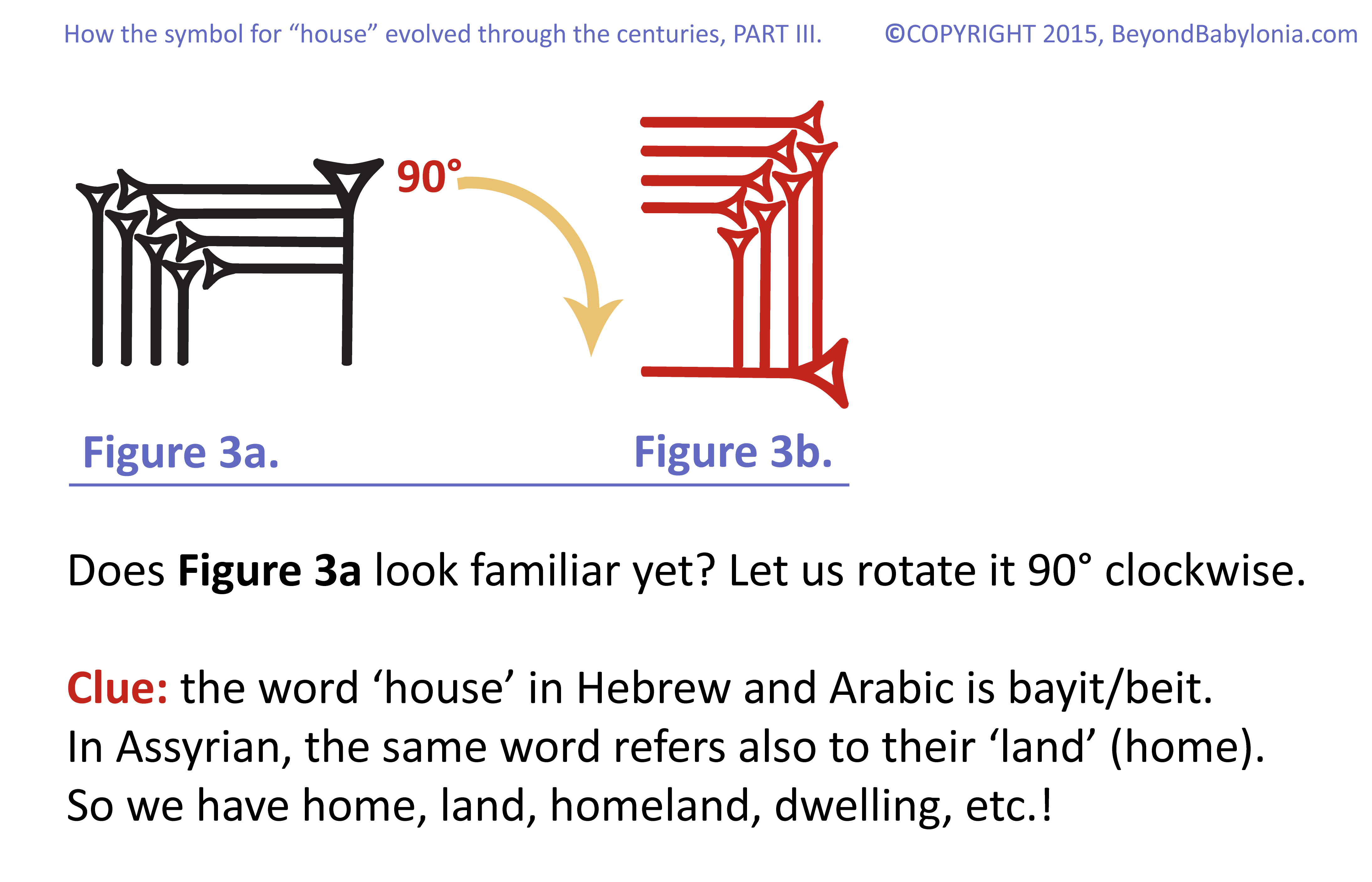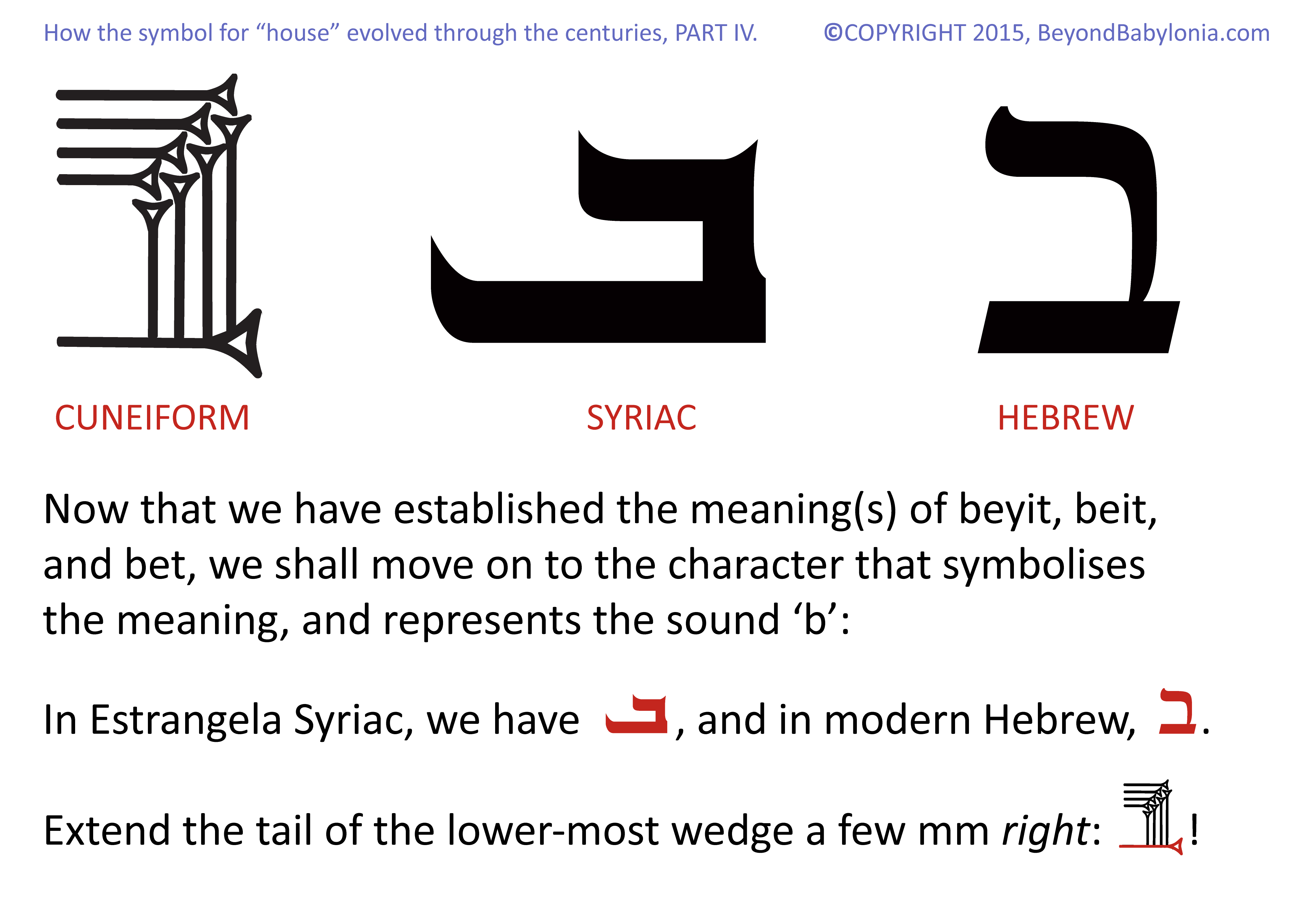 Now, let us take a gander at the evolution of early Akkadian pictographs into later Akkadian cuneiform, and see if we can recognize it using our modern Semitic language skills. The Hebrew ‘B’, ב, carries the symbolic reference of “house”, or “dwelling”. I provided Syriac in the illustration below; one cannot deny the resemblance between the three! BET-Evolution-04Just as the Phoenician alphabet rotated in various degrees will evoke to mind the Greek and Old Italic alphabet (toda raba, Agent-101), and even the Runic all the way in Scandinavia — similarly, we begin to see some resemblance between proto-Semitic cuneiform all the way to our many modern-day Semitic scripts.