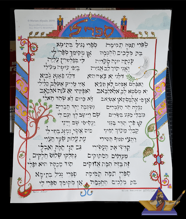 I decided this time around to create a piece reminiscent of Mediaeval illuminated manuscripts, and illustrated some of the key themes from the poem. This is in no way an accurate portrayal of illuminated manuscripts, from the modern materials I have used to the lack of design elements that are featured in proper manuscripts. All this should be considered is my commemorative piece, to exalt a forgotten poet, and to remember a bygone era of Yemen, where Hebrew could still be heard spoken on the streets of Sana’a.